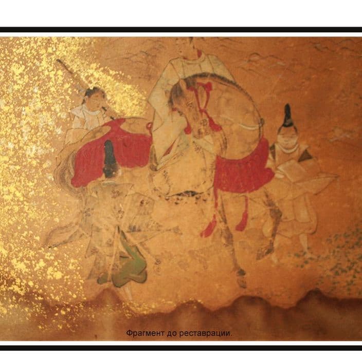 После «катастрофы» её хранили в неприспособленном помещении, и ширма приобрела стойкий затхлый запах. Плюс к этому деформация створок, расслоение бумаги и ткани ,осыпание красочного слоя. И огромный тёмно - коричневый затёк по всей длине нижней части .