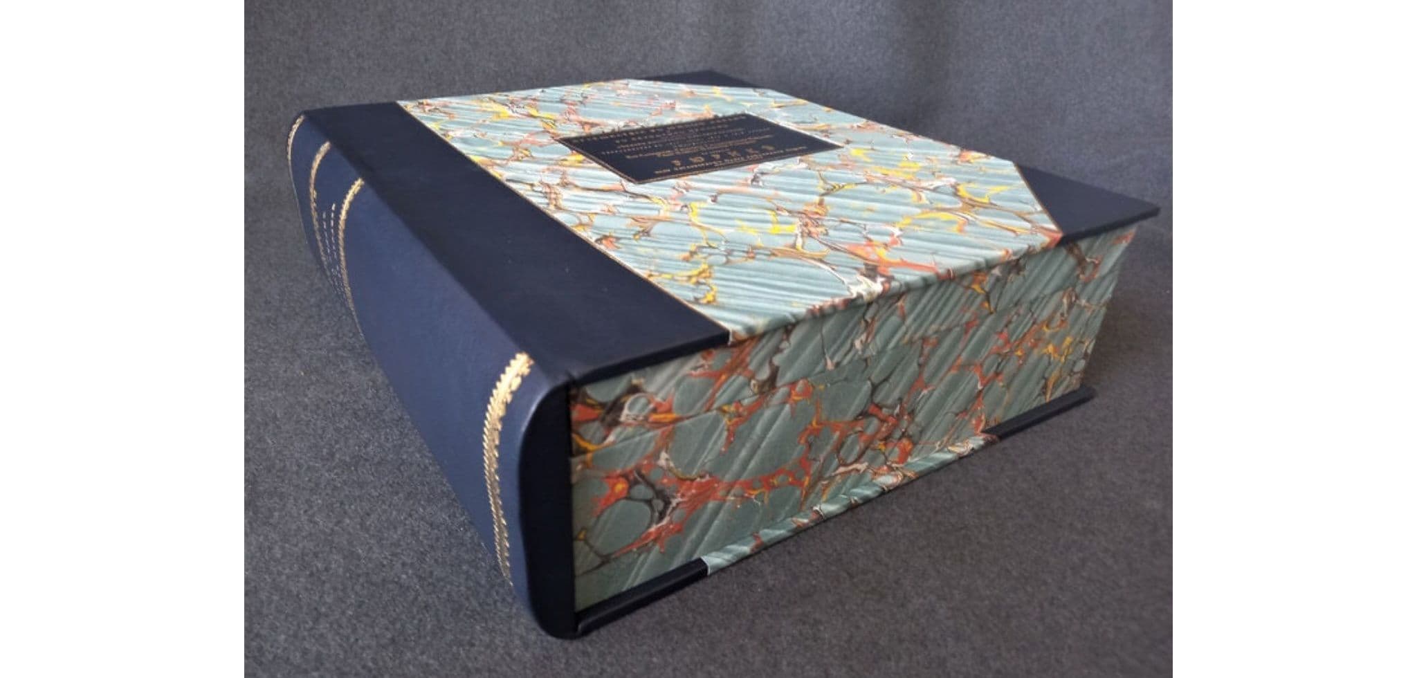 Футляр изготовлен из кожи козы с мраморной бумагой ручной работы. Кругленый корешок с аккуратными бинтами и центральная кожаная вставка с полным повторением титульного листа.